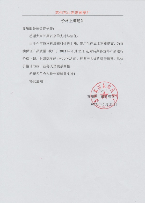 由于今年原材料及辅料价格上涨,我厂生产成本不断提高,为持续保证产品质量,我厂于2021年6月11日起对莼菜各规格产品进行价格上调,上调幅度在15%-20%之间,根据产品规格进行调整。具体价格请与我厂业务人员联系商榷。
